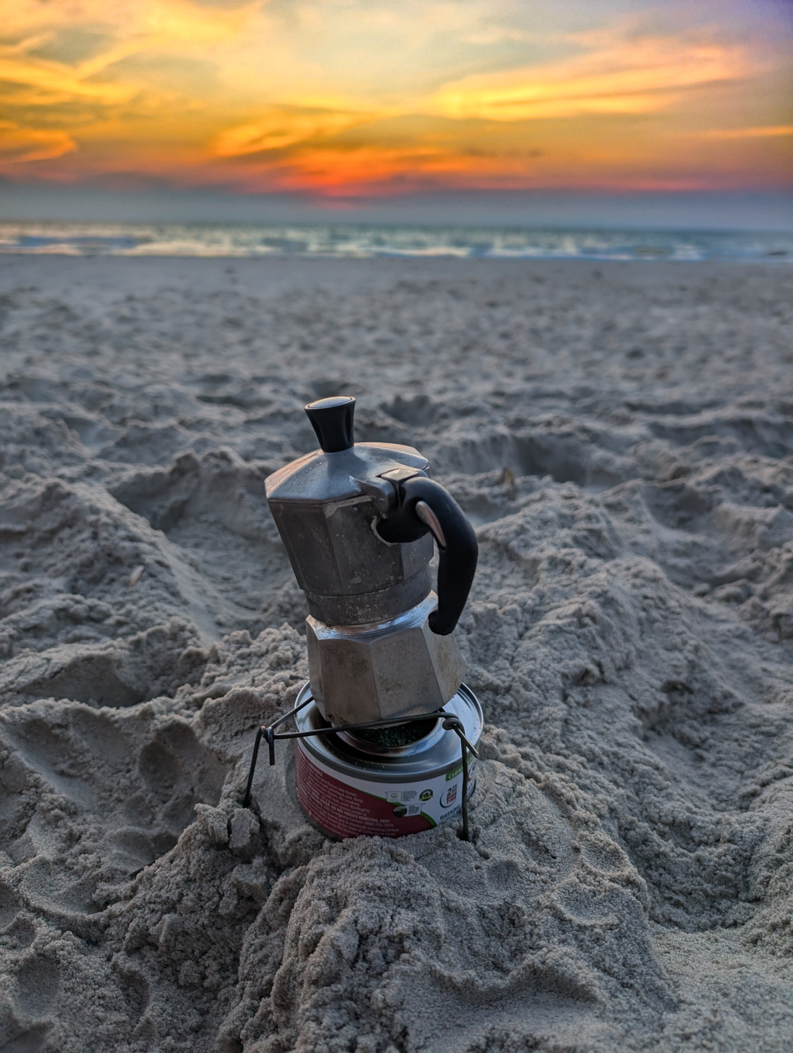Then came the battle for coffee. I had my moka pot but no stove. Only a can of Sterno canned heat and a stubborn BIC lighter. Lighting it in the wind was like a medieval trial. I knelt in the sand for an hour shielding the flame, waiting for the moka’s sacred hiss. When the coffee finally arrived… I was too tired to drink it.
